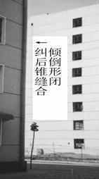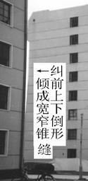 采用掏土灌水法設計施工的該項工程,糾傾工作共進行了2個月。各觀測點傾斜值全部已回至規(guī)范要求范圍,內(nèi)外縱墻原有裂縫大部分已閉合。從糾傾前照片可以看出,傾斜樓房山墻與鄰近參照建筑物墻體間在垂直方向上形成了上寬下窄的倒錐形縫,糾傾后建筑物與參照建筑物間的倒錐形縫已閉合(圖2)。
