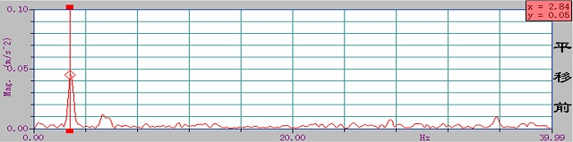 平移前的測(cè)試結(jié)果:根據(jù)實(shí)測(cè)的實(shí)時(shí)譜曲線(xiàn),平移前二層樓面振動(dòng)測(cè)點(diǎn)的主頻為2.84HZ(振動(dòng)周期0.35s)。