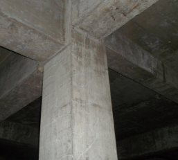 我所技術(shù)人員于2013年7月赴現(xiàn)場進(jìn)行了檢測,檢測結(jié)果表明,車庫中心位置上浮位移值最大,上浮后柱底最大高層超過20cm??蚣苤谏细∥灰飘a(chǎn)生的附加軸力及附加彎矩的作用下,產(chǎn)生了開裂及壓碎現(xiàn)象(圖3、圖4)??蚣芰憾藗?cè)面部出現(xiàn)了剪切斜裂縫、梁端底部出現(xiàn)水平裂縫(圖5),特別是車庫與高層住宅交界位置,梁端開裂較為明顯。在車庫頂梁板與車庫外周擋土墻交界位置處附加彎矩的作用下,除梁端裂縫外,擋土墻在梁底標(biāo)高以下位置出現(xiàn)通長水平裂縫。沿車庫平面跨中位置車庫平面縱向,車庫頂板出現(xiàn)兩條通長裂縫;車庫入口處沿車庫平面橫向,車庫頂板同樣出現(xiàn)兩條通長裂縫,頂板裂縫均與上浮位移較大軸線相對應(yīng)。