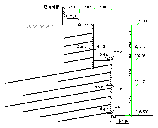 中國華能集團公司白楊河電廠新開挖邊坡高14.5m,為永久性邊坡,屬于一級邊坡,由于邊坡邊緣距離坡頂臨近建筑物圍墻較近,為了保證邊坡建筑物安全和邊坡自身安全,需要對邊坡進行支護。該方案采用兩級超前支護微型樁,坡頂邊緣距離坡頂建筑物外墻邊緣6m,沿頂部坡面設置三排6m的錨桿(水平間距1.5m),與水平向夾角為15°,保證上部錨桿長度在圍墻以外。沿底部坡面自上而下設置6排錨桿,其中第2道和第4道為預應力錨桿,第3道為錨桿處于第5層碎石層位置,其主體為Φ48鋼管。在兩級坡面之間的平臺寬度為2m。