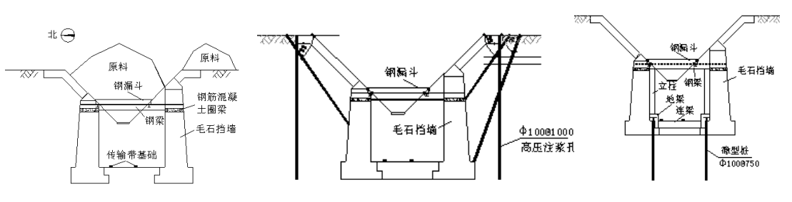 某鋼廠原料場受料槽建于1966年,其皮帶通廊位于地面以下,通廊墻壁采用毛石砌筑,墻壁下為毛石基礎,料倉料斗支承在鋼梁上,鋼梁支撐在毛石墻上(圖1)。地面以上采用鋼筋混凝土框架結構,上部結構總裝圖見圖2。該鋼廠1966年的鋼鐵年產(chǎn)量為約100萬噸,2004年年產(chǎn)量達到640萬噸,2005年年產(chǎn)量預計在1000萬噸。由于原料場受料槽的建設速度遠遠低于鋼鐵產(chǎn)量的增長速度,使得該原料場受料槽一直處于超負荷運轉(zhuǎn)。經(jīng)過40多年的運轉(zhuǎn),該原料場綜合受料槽各部件出現(xiàn)不同程度的損壞。