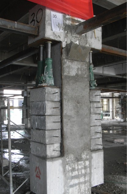 濟(jì)寧銀座商場(chǎng)(原華聯(lián)商廈)二期,為四層(局部六層)框架結(jié)構(gòu),建于1992年。原設(shè)計(jì)該建筑物的四層和五層層高為2.9m,現(xiàn)已不能滿足使用要求,每層需整體抬升1.1m