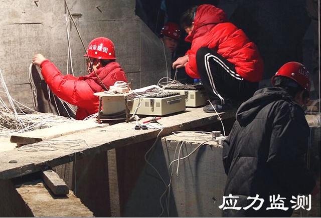在平移施工前及平移施工過程中,隨時(shí)監(jiān)測托換梁的應(yīng)力及整個(gè)建筑物的沉降、傾斜、振動(dòng)情況等。