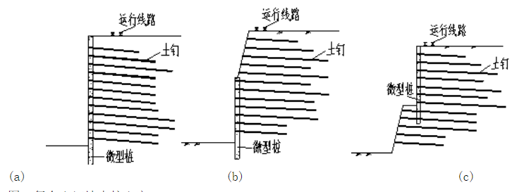 考慮到工程場地周邊條件(南側(cè)緊靠運行線路)和地質(zhì)條件(上部填土較厚),考慮到工程對安全、工期和經(jīng)濟的要求,綜合考慮決定采用微型樁+土釘錨桿的復(fù)合土釘墻支護方案。這種形式的復(fù)合土釘墻有三種類型,不同工程技術(shù)人員對不同方案表達了支持意見,現(xiàn)分述如下:
