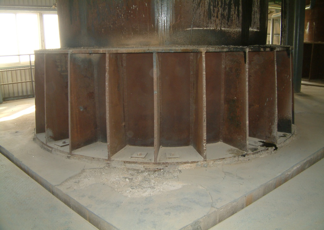 某礦業(yè)公司重?zé)G基礎(chǔ)采用鋼筋混凝土框架結(jié)構(gòu),框架底部為筏板,底標高為-3.50m,其上置方形鋼筋混凝土柱。頂部為一厚1.40m由耐熱混凝土澆筑的平臺,平臺頂面標高為12.00m,中央為一半徑為1.73m的圓孔,重近400t豎窯即通過加肋環(huán)形鋼托盤支撐于平臺圓孔周邊混凝土頂面(圖1)。
