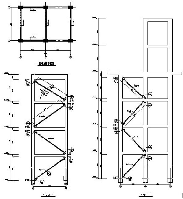 魯西化工廠銅洗框架,4層(局部6層)框架,頂部擱置一液體儲(chǔ)箱。使用過(guò)程中在風(fēng)的作用下液面晃動(dòng),使結(jié)構(gòu)出現(xiàn)較大幅度振動(dòng),頂層有明顯振感。采取增加耗能鋼支撐的方法增強(qiáng)結(jié)構(gòu)剛度,減輕振動(dòng)效應(yīng)。